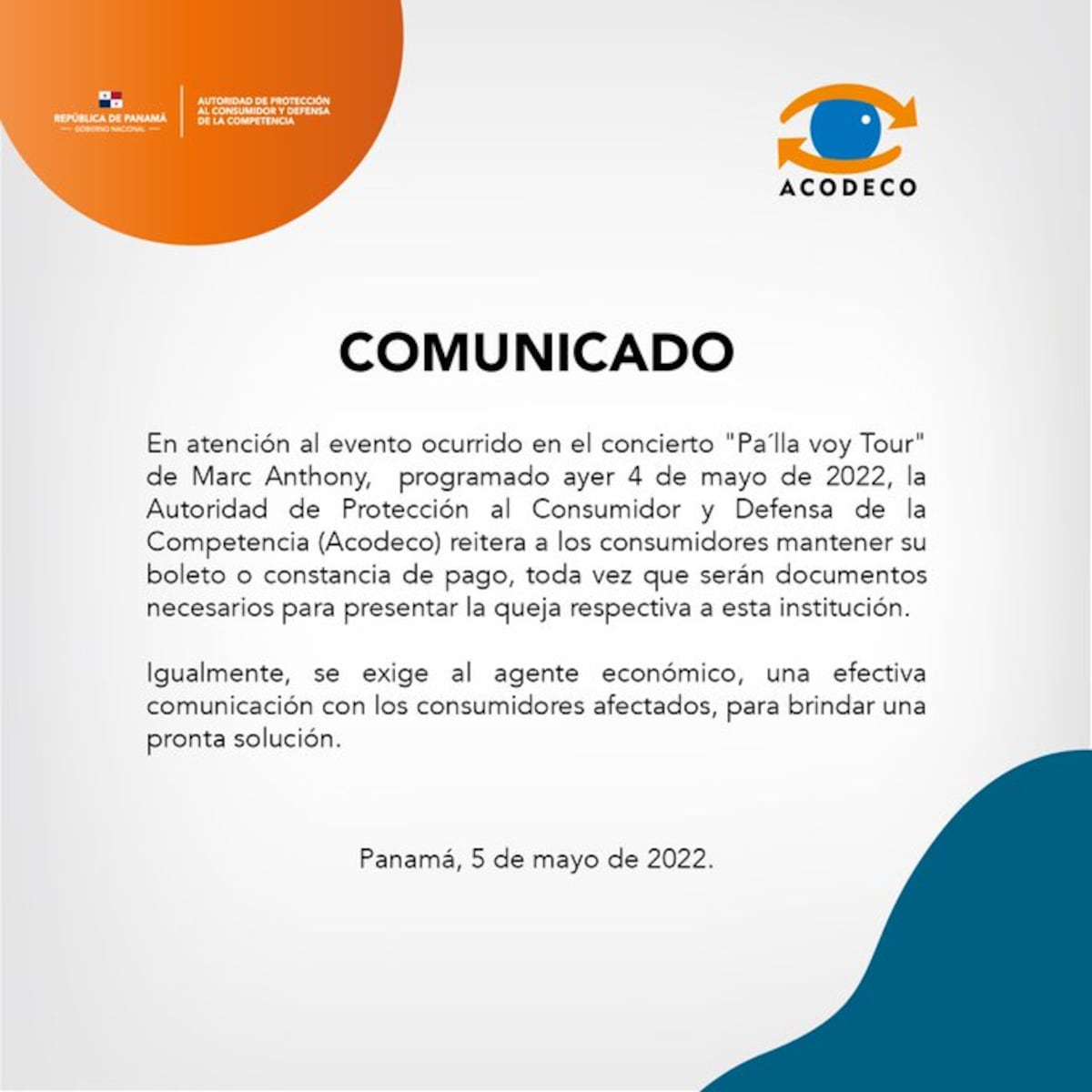 En atención al evento ocurrido en el concierto “Pa´lla voy Tour” de Marc Anthony, programado ayer 4 de mayo de 2022, la Autoridad de Protección al Consumidor y Defensa de la Competencia (Acodeco) reitera a los consumidores mantener su boleto o constancia de pago, toda vez que serán documentos necesarios para presentar la queja respectiva a esta institución.