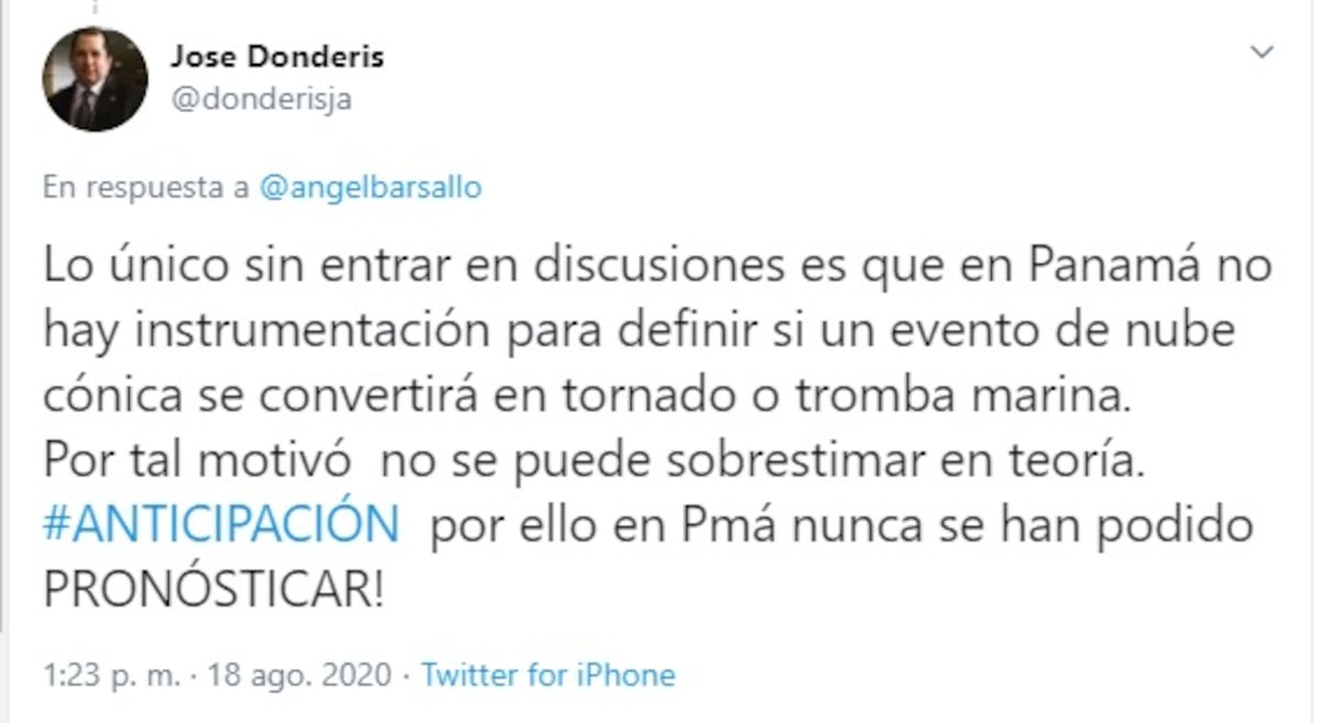 “Lo único sin entrar en discusiones es que en Panamá no hay instrumentación para definir si un evento de nube cónica se convertirá en tornado o tromba marina. Por tal motivo, no se puede sobrestimar en teoría. #ANTICIPACIÓN por ello en Panamá nunca se han podido PRONOSTICAR”, dijo Donderis.