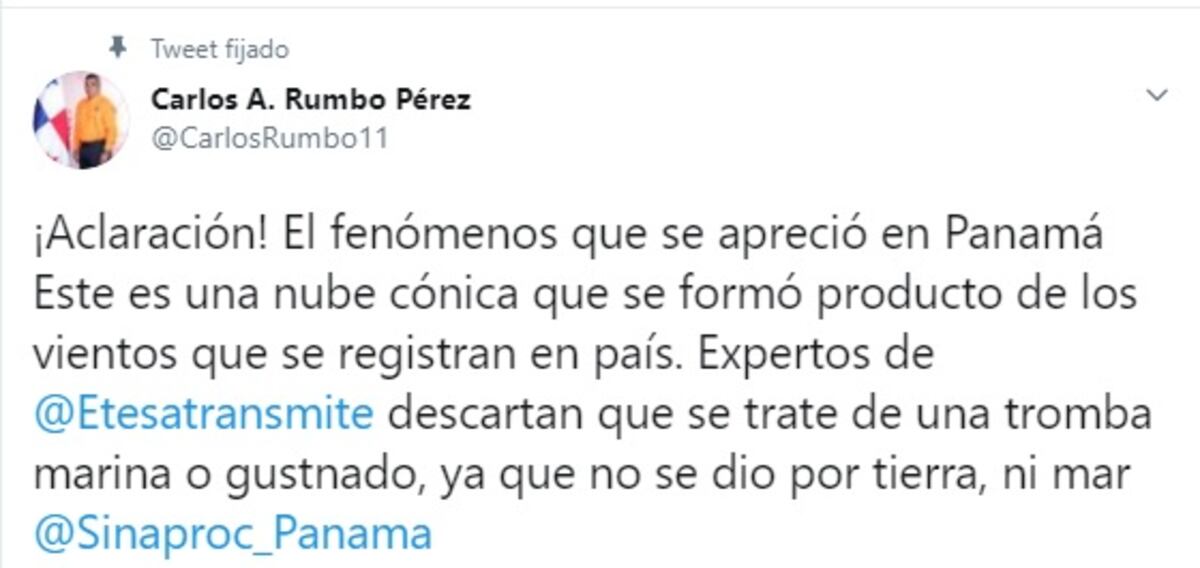“¡Aclaración! El fenómeno que se apreció en Panamá Este es una nube cónica que se formó producto de los vientos que se registran en país. Expertos de Etesa descartan que se trate de una tromba marina o gustnado, ya que no se dio por tierra, ni mar”, dijo Rumbo Pérez.