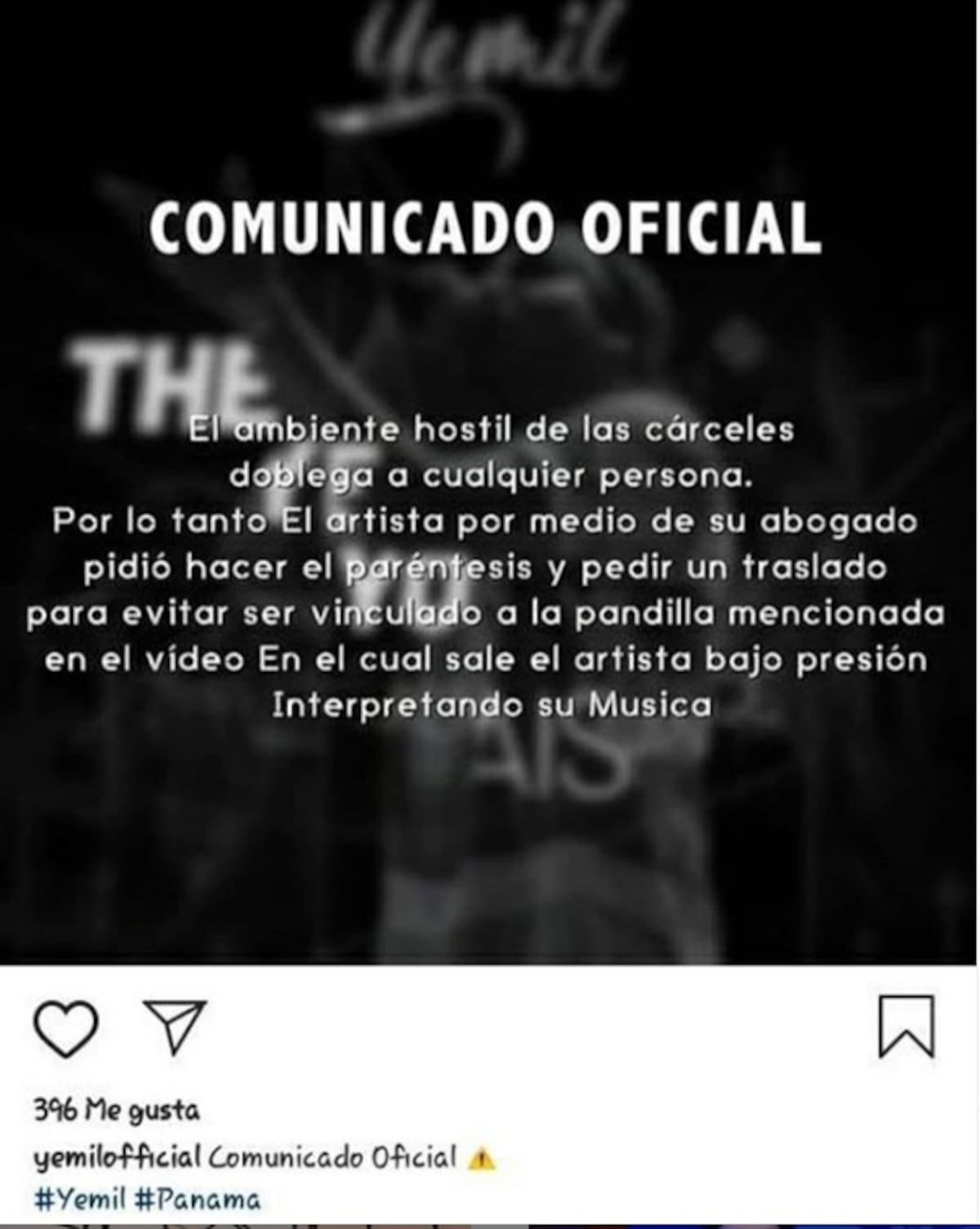 “El ambiente hostil de las cárceles doblega a cualquier persona. Por lo tanto el artista por medio de su abogado pidió hacer el paréntesis y pedir un traslado para evitar ser vinculado a la pandilla mencionada en el video en el cuál sale el artista bajo presión interpretando su música” dice el comunicado que se difundió en la cuenta de Instagram del cantante y que luego fue borrado.