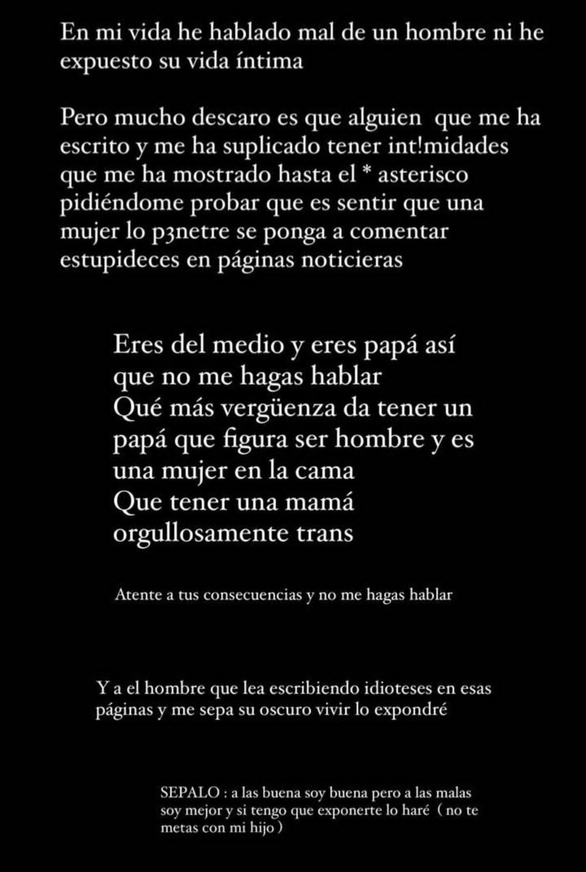 “En mi vida he hablado mal de un hombre ni he expuesto su vida íntima, pero mucho descaro es que alguien que me ha escrito y me ha suplicado tener int!midades que me ha mostrado hasta el * asterisco pidiéndome probar que es sentir que una mujer lo p3netre se ponga a comentar estupideces en páginas noticieras. Eres del medio y eres papá así que no me hagas hablar qué más vergüenza da tener un papá que figura ser hombre y es una mujer en la cama, que tener una mamá orgullosamente trans. Atente a tus consecuencias y no me hagas hablar y a el hombre que lea escribiendo idioteses en esas páginas y me sepa su oscuro vivir lo expondré. Sépalo : a las buena soy buena, pero a las malas soy mejor y si tengo que exponerte lo haré ( no te metas con mi hijo )”, destacó.