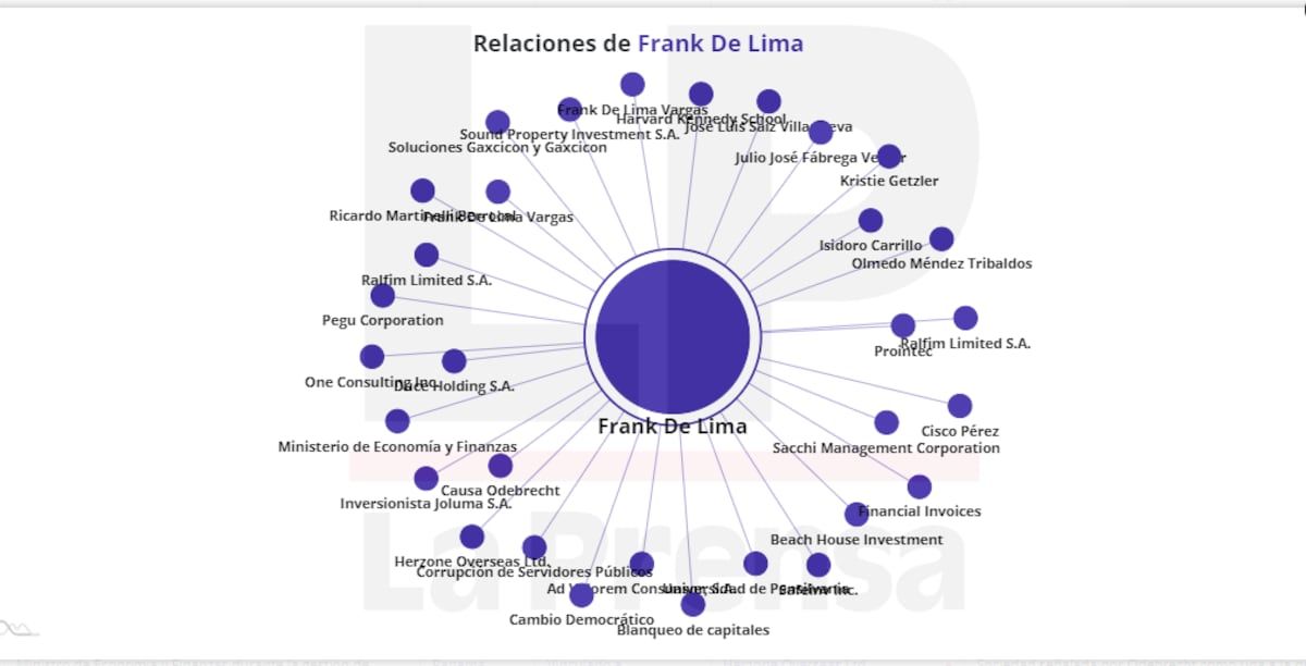 Las relaciones del exministro Frank De Lima en Panabrecht.El patrimonio de De Lima creció abruptamente en su paso por el MEF. Entre 2012 y 2014, adquirió fincas y proyectos a través de dos testaferros que contaron todo a los fiscales. Las compras tuvieron una vuelta entreverada con un puñado de sociedades, cuentas en Luxemburgo y Suiza, diez facturas y cheques de gerencia, hasta llegar a otras sociedades que finalmente obtuvieron cosas como un inmueble en Plaza Camino de Cruces, un diplomado en Harvard Kennedy School y un curso en la Universidad de Pensilvania.