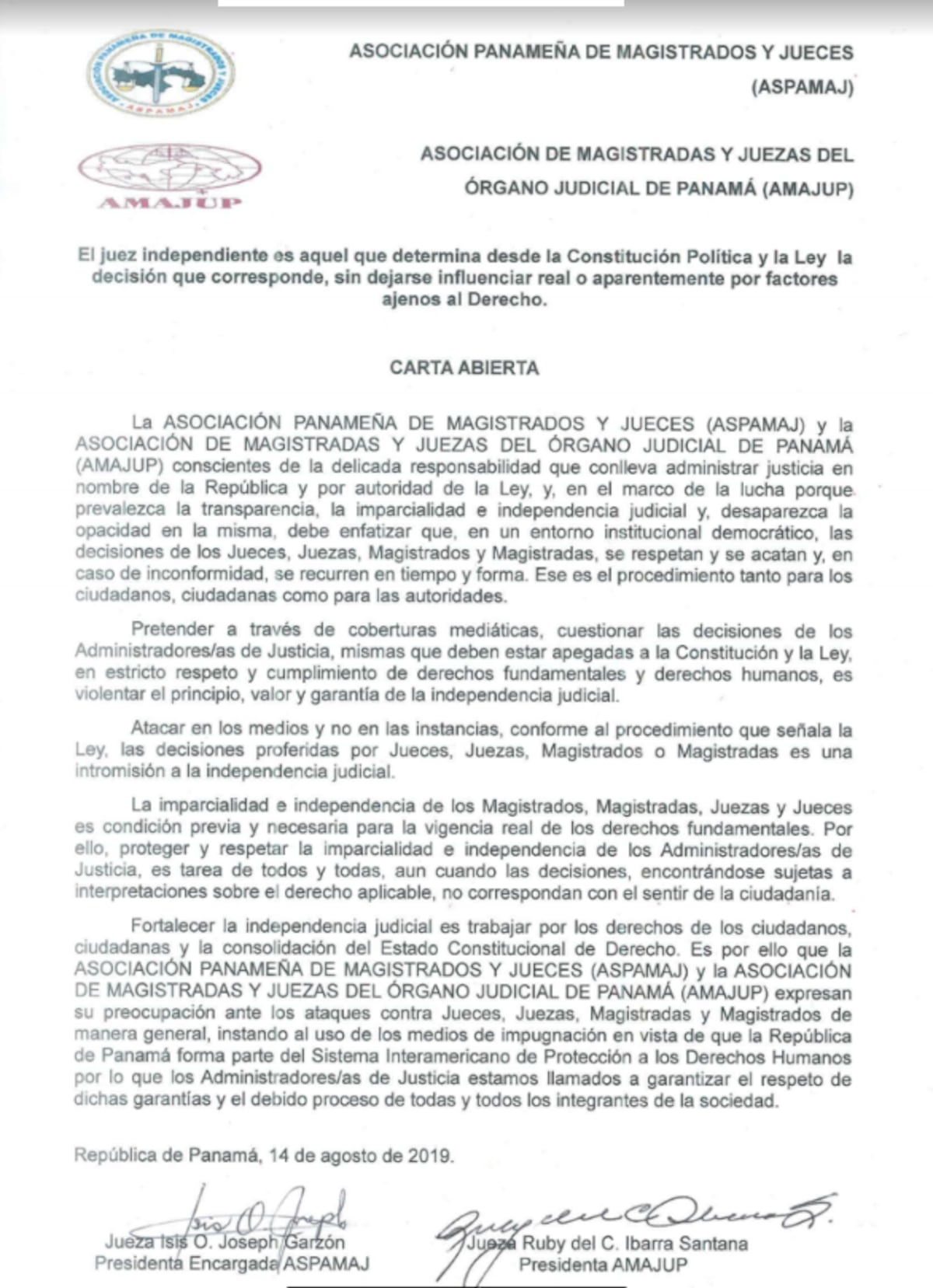 La Asociación Panameña de Magistrados y Jueces (ASPAMAJ) ,en una carta abierta enfatizó que pretender a través de coberturas mediáticas, cuestionar las decisiones de los Administradores de Justicia, es violentar el principio, valor y garantía de la independencia judicial.