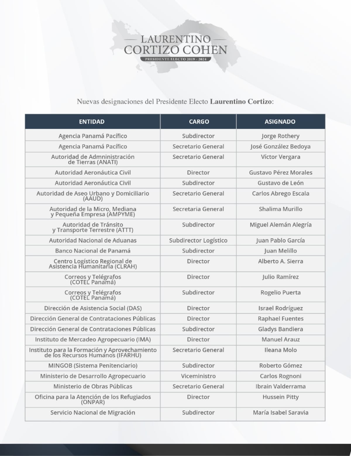 Hay nuevos nombramientos que formarán parte del gobierno del presidente electo Laurentino “Nito” Cortizo, quien el 1 de julio tomará posesión del cargo, aún quedan pendientes algunos puestos.