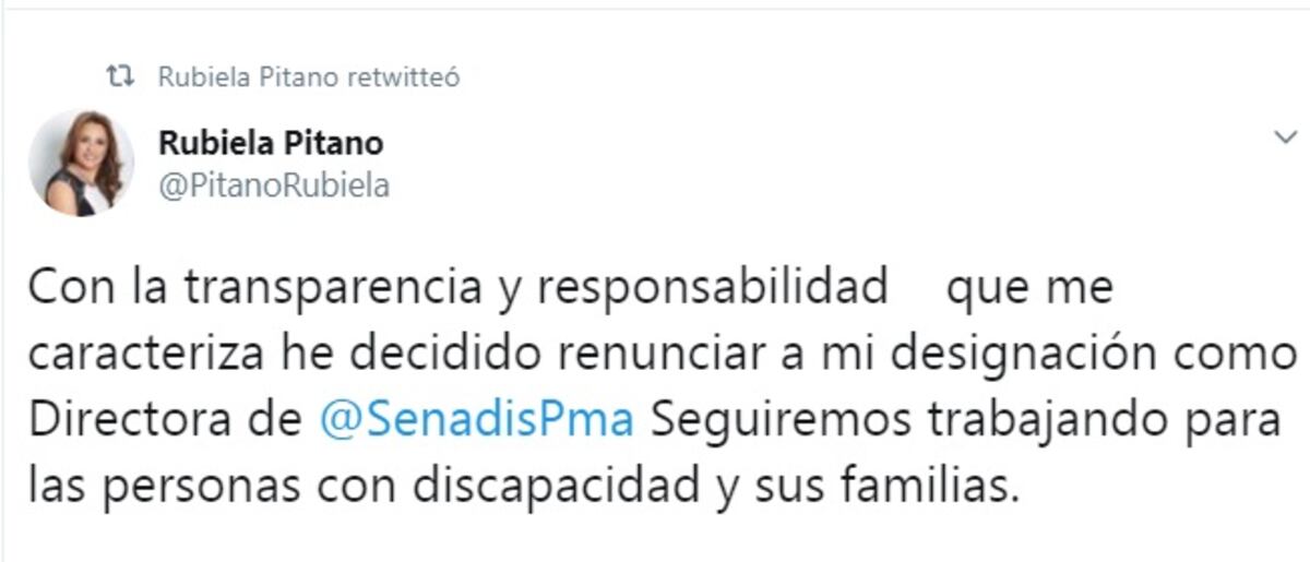 La recién designada Directora Nacional de la Secretaría Nacional de Discapacidad (SENADIS), Rubiela Pitano, confirmó su decisión de declinar al cargo, según dijo, por la necesidad de atender la situación legal en la que se le ha vinculado recientemente.