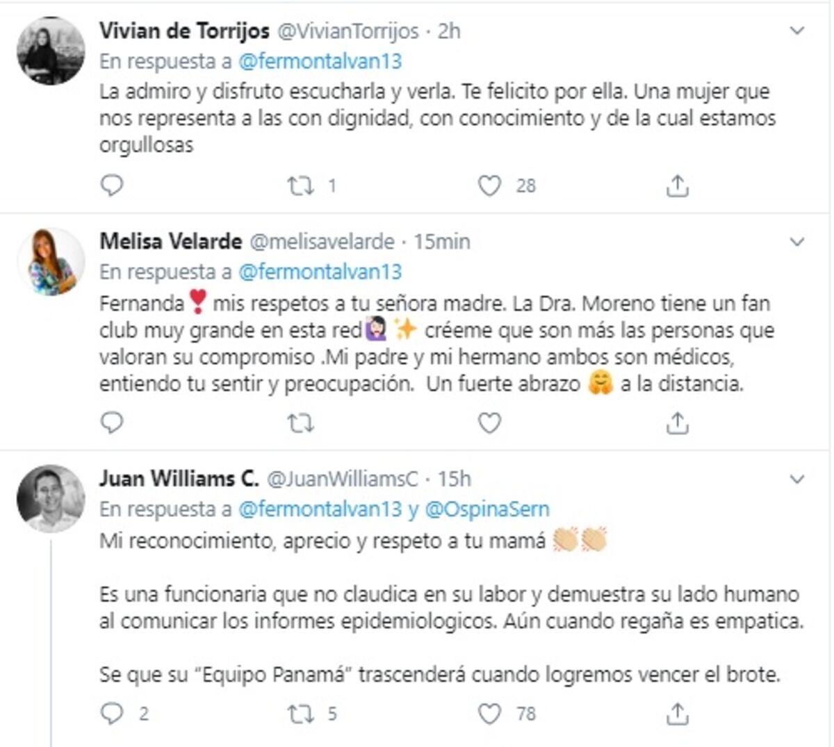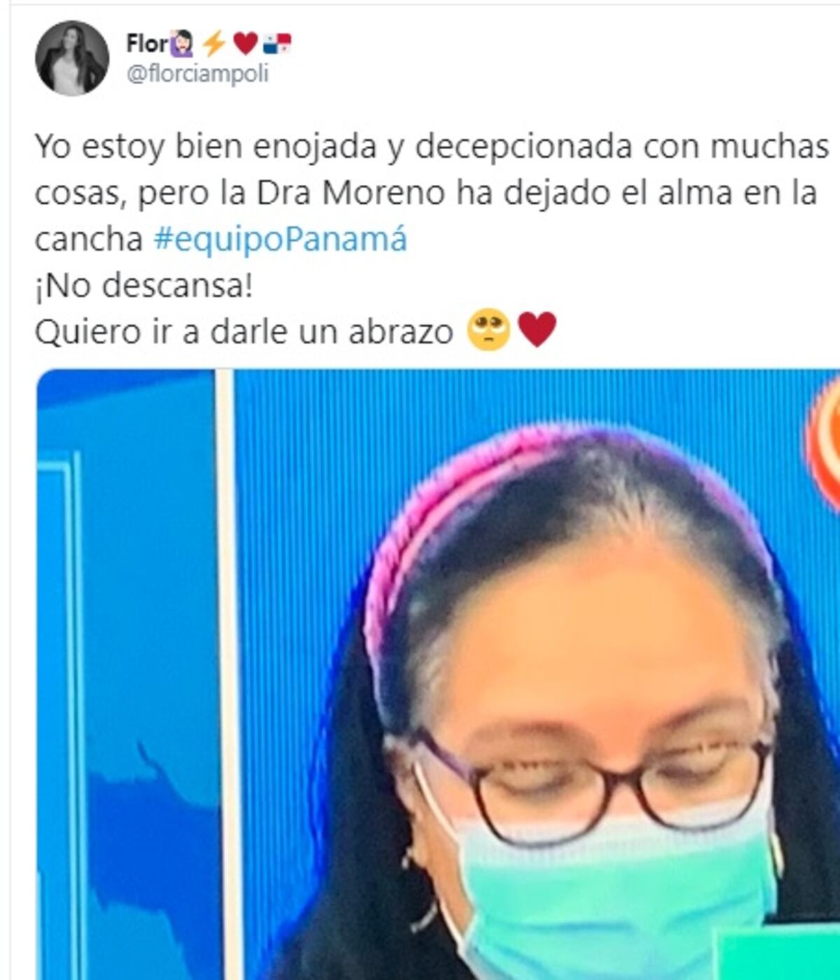 Explicó que “hay mil historias detrás que no conocen, y tal vez nunca sabrán; pero a nosotros como familia nos ha tocado vivirlas e incluso sufrirlas. Para ustedes la Dra. Lourdes Moreno “Equipo Panamá”... Para mí, mi mamá... una mujer luchadora, entregada a su trabajo desde siempre; tengan la certeza de que va a seguir ahí al pie del cañón dando lo mejor de ella día a día”, dijo.