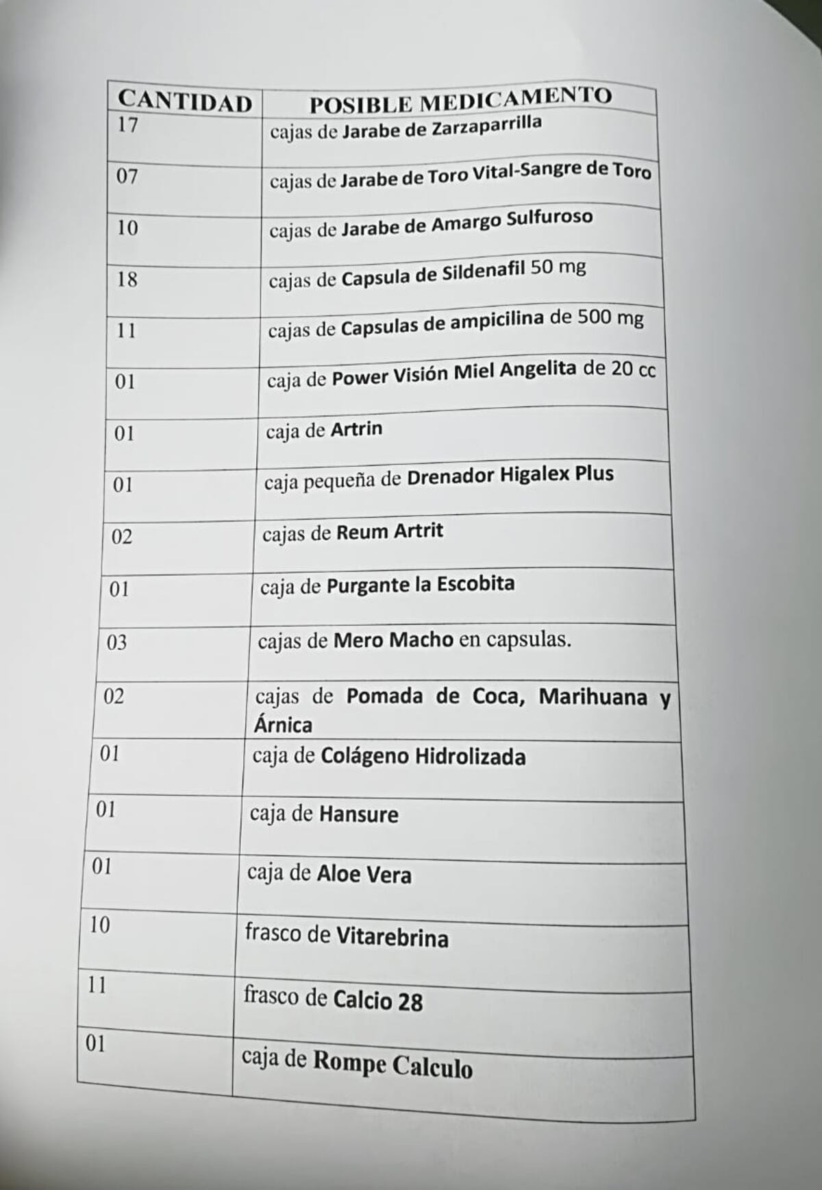 Entre los medicamentos decomisados están tres cajas de Mero Macho en cápsulas, este potenciador sexual masculino está prohibido en el país. Además, dos cajas de Pomada de Coca, Marihuana y Árnica, una caja de Aloe Vera, 11 cajas de cápsulas de ampicilina de 500 miligramos, 10 cajas de jarabe de Amargo Sulfuroso y 7 cajas de Jarabe de Toro Vital-Sangre de Toro, entre otros (ver la lista completa al final de la nota).