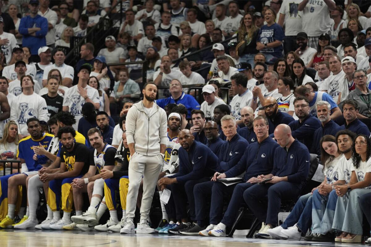 Steph Curry observa desde el banco el fin de temporada de Golden State.Desde el inicio, los locales impusieron el ritmo. Ya en la primera mitad sacaron ventaja de 15 puntos (62-47) y aumentaron a 25 en el tercer cuarto. Los Warriors intentaron reaccionar, pero no les alcanzó.