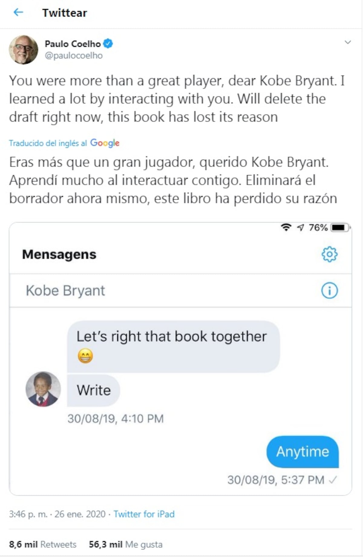 El proyecto del libro era muy casual. Tras no comunicarse durante varios meses, Bryant envió un mensaje a Coelho en agosto diciendo: “Escribamos ese libro juntos”.