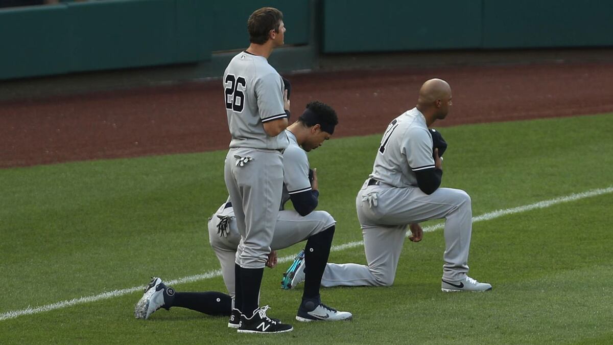 Stanton y el guardabosque Hicks se convirtieron en los primeros miembros de los Bombarderos en arrodillarse durante el himno estadounidense antes del partido del sábado contra los Nacionales.