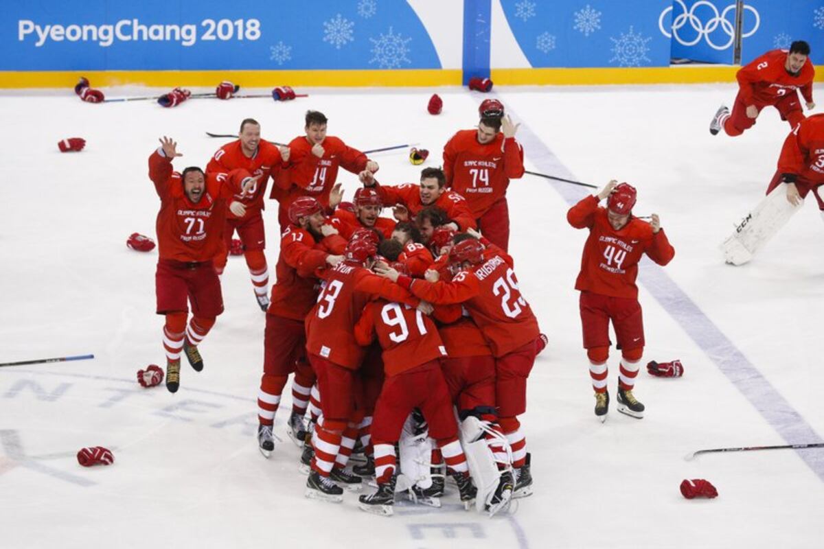 Cuando el equipo masculino de hockey ganó la medalla de oro en uniformes que hacían recordar a los de los jugadores de la “Máquina Roja” de la Unión Soviética, los jugadores entonaron el himno nacional, aun sin música. El presidente ruso Vladimir Putin llamó al entrenador que estaba en la banca y lo felicitó.