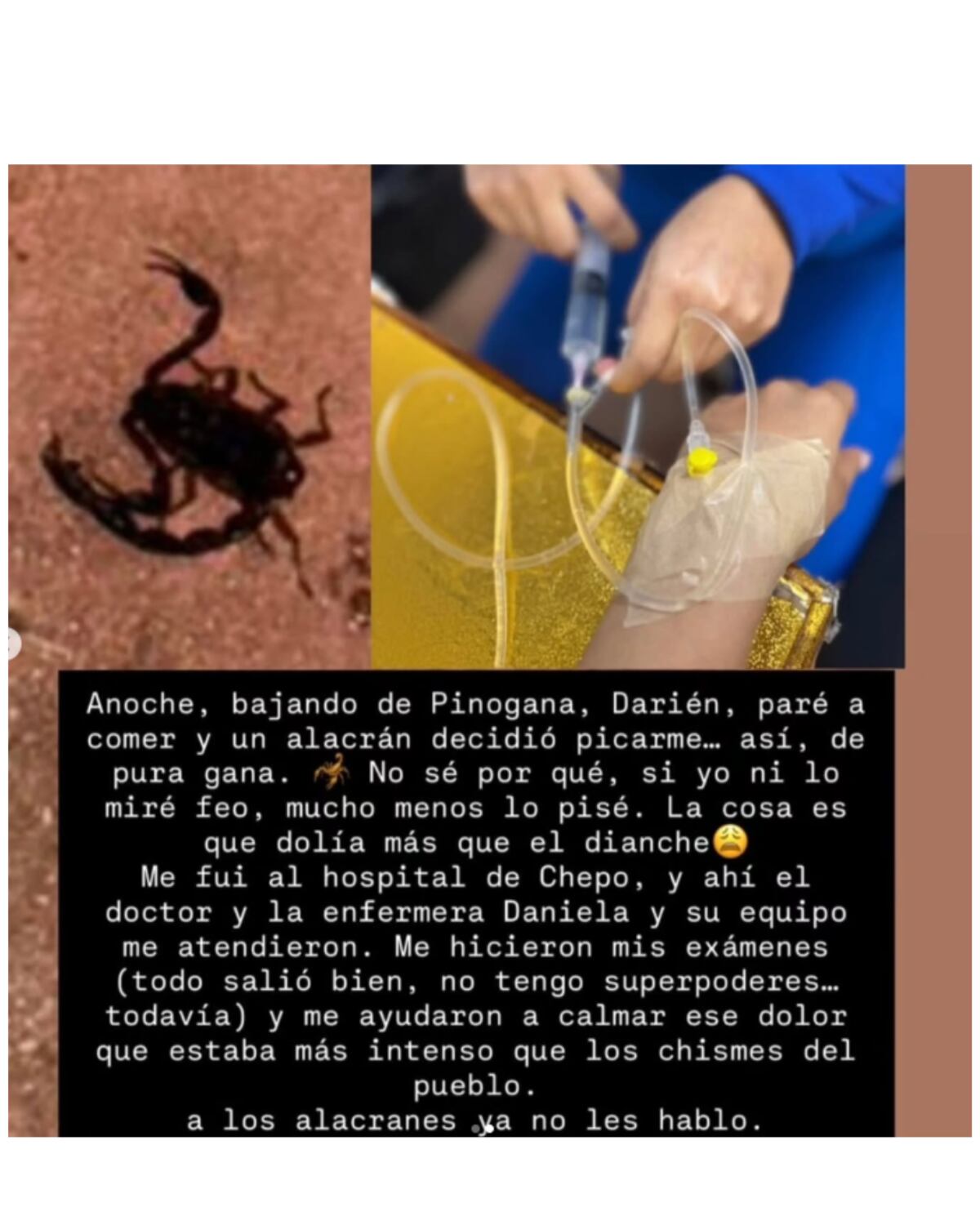 Su publicación en Instagram no tardó en hacerse viral, recibiendo decenas de comentarios de sus seguidores, quienes además de mandarle buena vibra, no perdieron la oportunidad de lanzar chistes sobre el “alacranazo”.