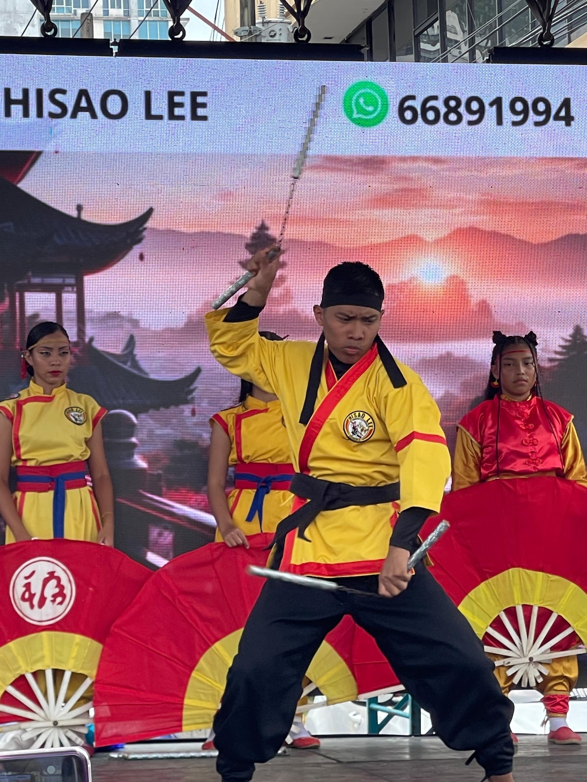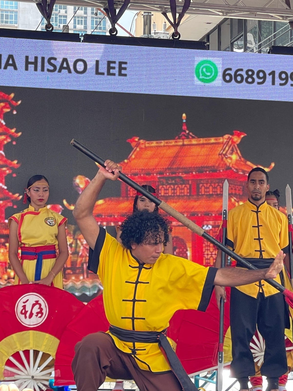 La academia de artes marciales Hisao Lee ofreció una vistosa demostración de kung-fu con armas como el bo, nunchaku, triple nunchaku, dragón de dos cabezas y lanza.