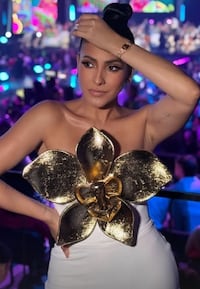 La creación fue ideada por Michelle Gregoire, trabajada en oro por Michelle Ferrer y entallada a la perfección por Santos Jorge. El look no pasó desapercibido y se convirtió en uno de los más virales de la noche.