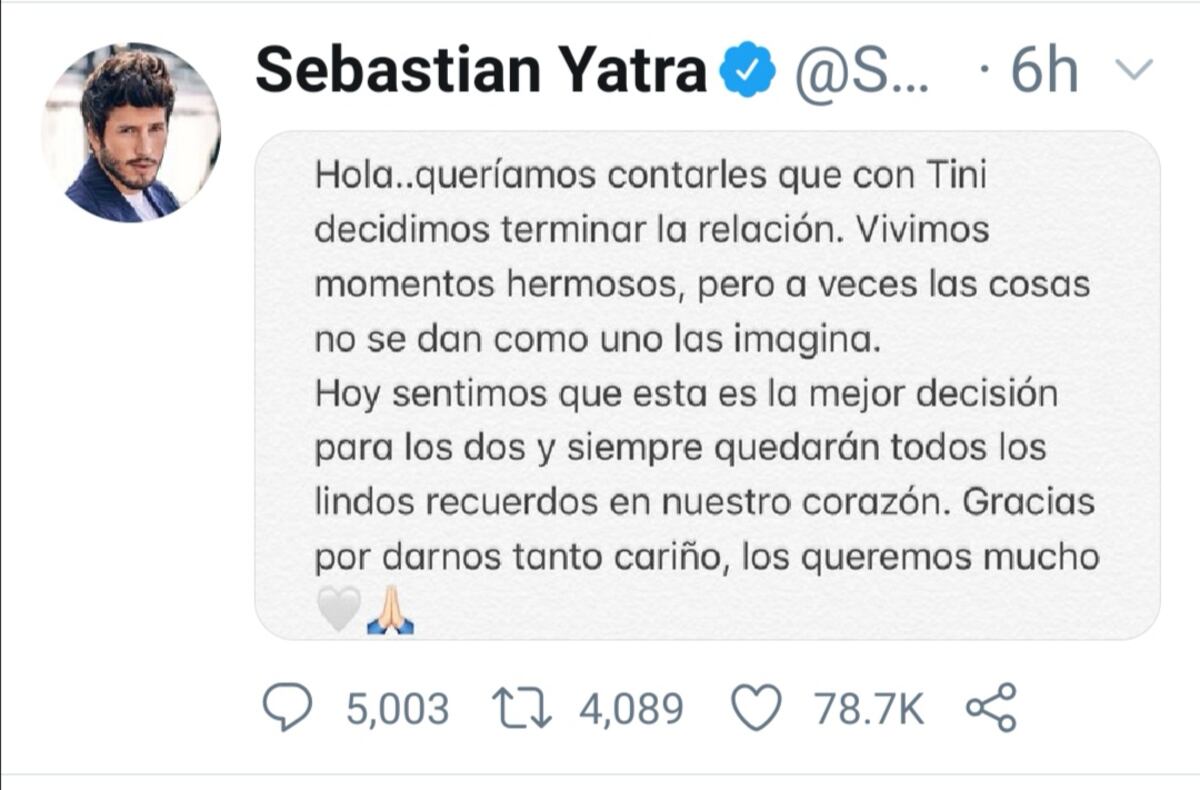 Fue a través de sus redes sociales que ambos artistas hicieron el anuncio, que en primera instancia fue tomada como una broma, considerando el buen humor del colombiano. Sin embargo, las horas pasaron y la noticia fue confirmada. Primero fue Tini quien posteó la triste noticia y luego Yatra la recalcó.