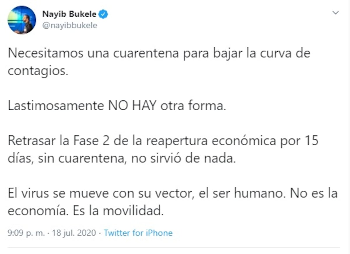 Por otro lado, Bukele se mostró contrariado ante las cifras epidemiológicas que se han venido disparando, porque aseguró que lo único que las detendrá es una cuarentena total estricta, por 15 días, pero los parlamentarios en su país no apoyan esa medida.
