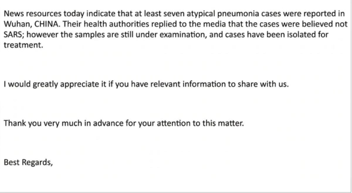 El correo electrónico hecho público señala: “Fuentes de noticias indican hoy que al menos siete casos de neumonía atípica fueron reportados en Wuhan, China. Sus autoridades sanitarias respondieron a los medios que no creían que los casos fueran SARS; sin embargo, los ejemplos están todavía bajo estudio, y los casos fueron aislados para tratamiento. Agradecería mucho si tienen información relevante para compartir con nosotros. Muchas gracias por su atención en este asunto”.