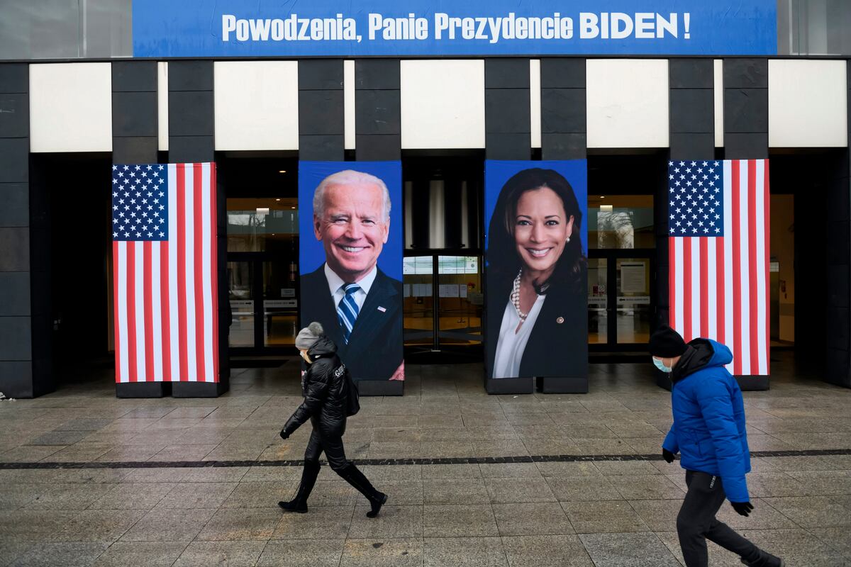 Poznan (Poland), 20/01/2021.- A view of posters of US President-elect Joe Biden and Vice President-elect Kamala Harris on the facade of the Marshal Office of the Wielkopolska Region in Poznan, west-central Poland, 20 January 2021. Biden will be sworn in as the 46th President of the United State during a ceremony at the US Capitol on 20 January. POLAND OUT