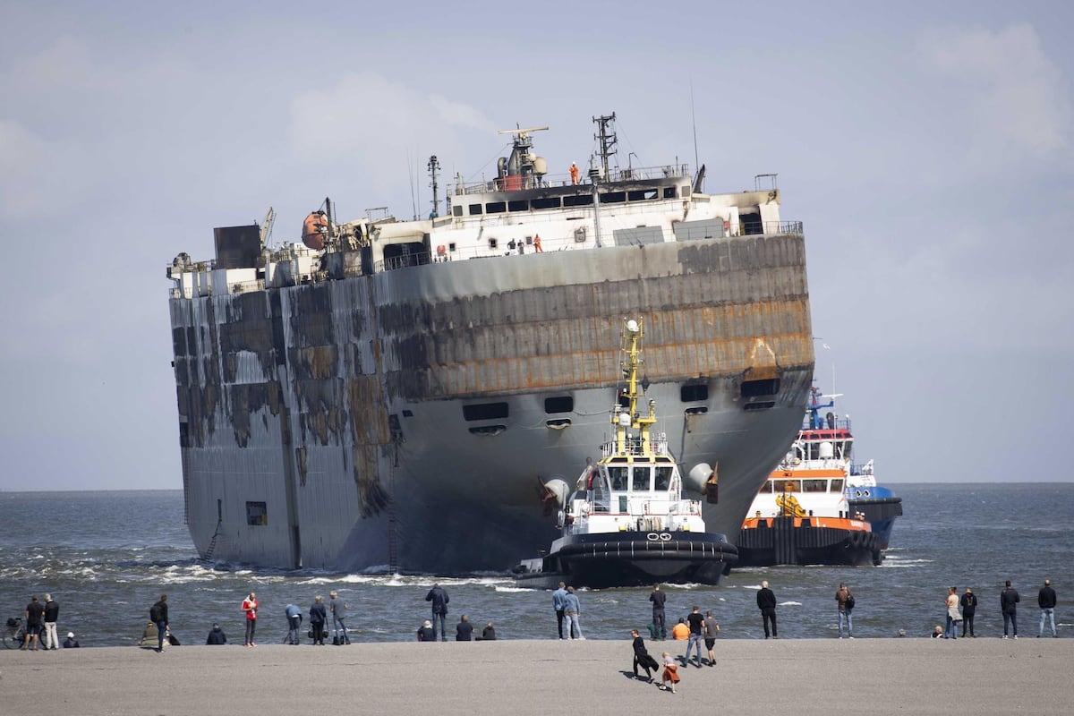 El buque de bandera panameña, que llevaba a bordo 3,784 vehículos nuevos, incluidos casi 500 eléctricos, llegó en la tarde de este jueves a Eemshaven, un puerto en Groninga, adonde fue trasladado por un remolcador en un estado visible de deterioro tras el incendio, y ahora se encuentra amarrado en el muelle y aislado con una pared de contenedores marítimos.