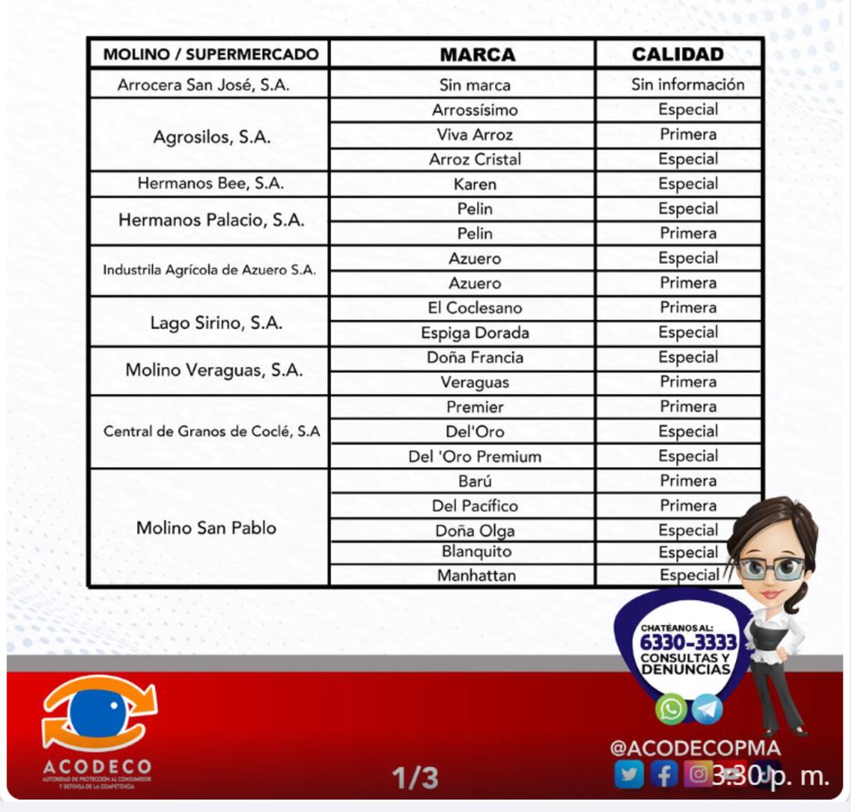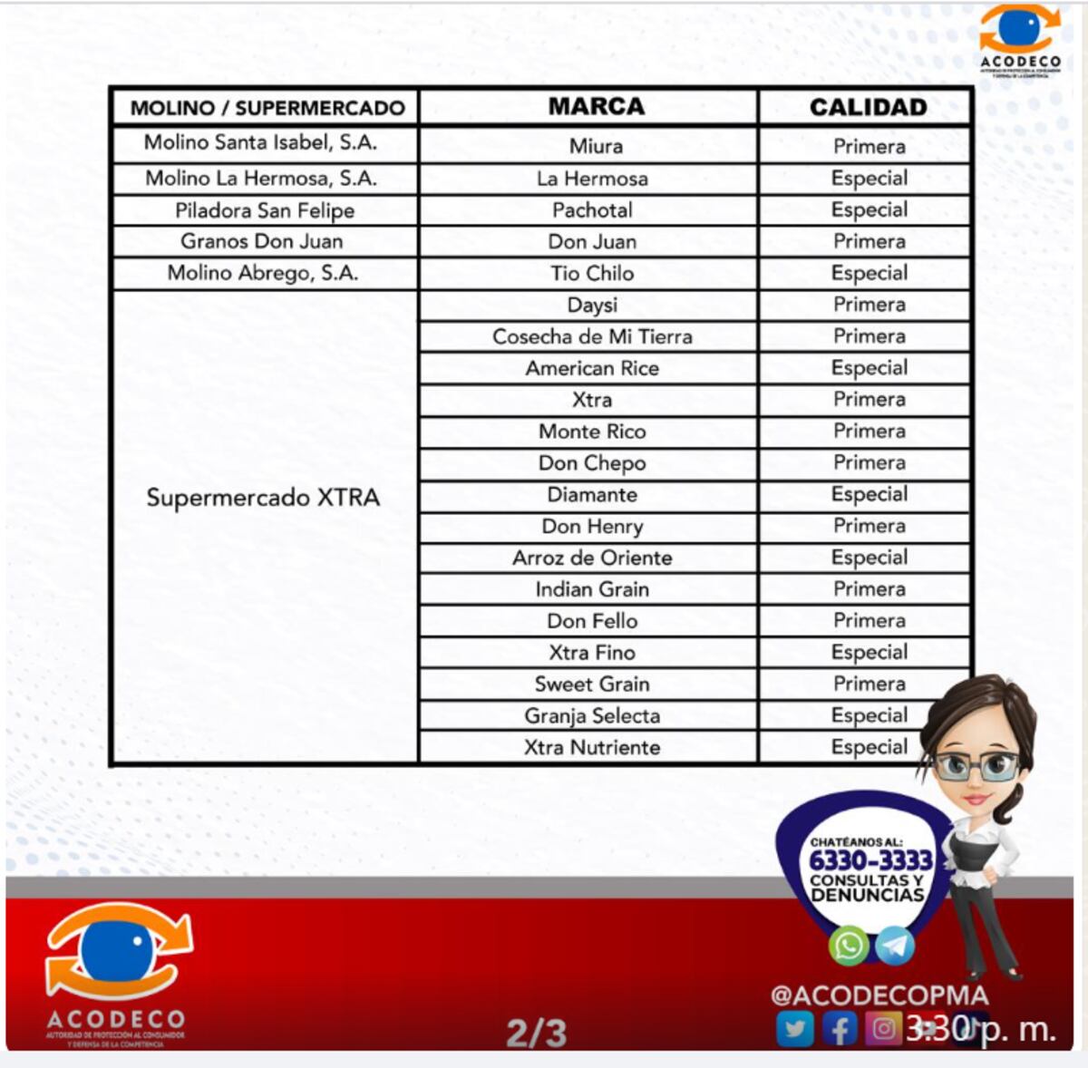 La entidad comunicó que el Departamento de Metrología de la Acodeco ha verificado un total de 63 marcas de arroz (35 especial y 28 de primera), de las cuales solo una marca de arroz especial y cinco de primera cumplieron con las pruebas de calidad.