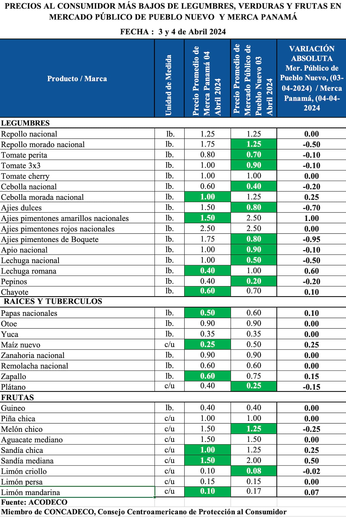 Lista de precios revisada por la Acodeco.En cuanto al Merca Panamá, según un sondeo realizado el 4 de abril, se encontraron precios más bajos en legumbres por libra, como los ajíes pimentones amarillos a B/. 1.50, la lechuga romana a B/. 0.40, y el chayote a B/. 0.60. En raíces y tubérculos, las papas se vendieron a B/. 0.50, el zapallo a B/. 0.60, y el maíz nuevo a B/. 0.25 cada uno. En frutas, la sandía chica estaba disponible desde B/. 1.00 y el limón mandarina a B/. 0.10 cada uno.