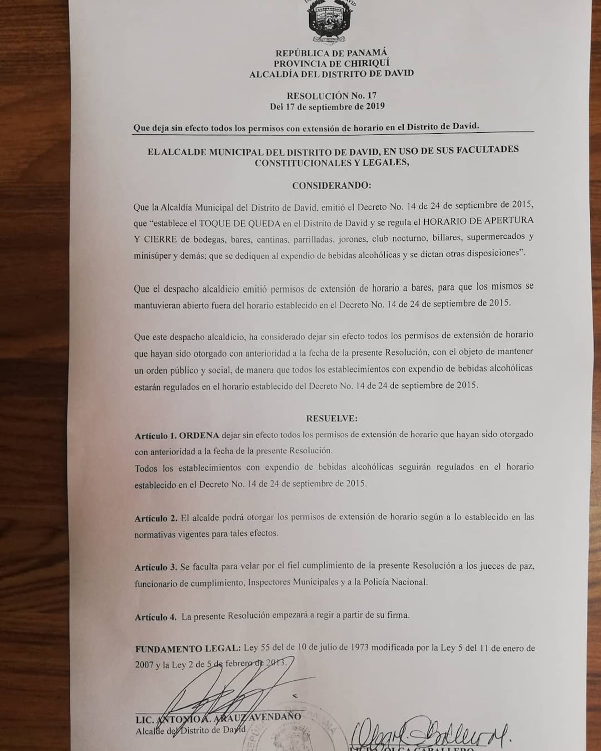 El nuevo alcalde de David, Antonio Araúz, firmó la Resolución N° 17, que anuló un permiso que el exalcalde Francisco Vigil emitió para extender las horas de expendio de bebidas alcohólicas en bares, bodegas, parrilladas, jorones, clubes nocturnos, billares y supermercados.