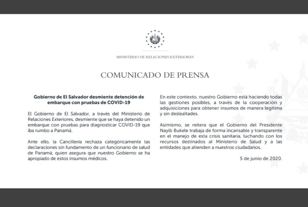 A través de un comunicado del Ministerio de Relaciones Exteriores de El Salvador, desmintió que se haya detenido un embarque con pruebas para diagnosticar covid-19 que iba rumbo a Panamá.
