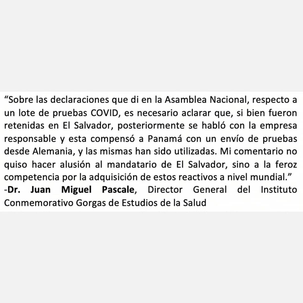 “Sobre las declaraciones que di en la Asamblea Nacional con respecto a un lote de pruebas covid-19, es necesario aclarar que, sin bien fueron retenidas en El Salvador, posteriormente se habló con la empresa responsable, y esta compensó a Panamá con un envío de pruebas desde Alemania, y las mismas han sido utilizadas”, dijo Pascale en un comunicado.