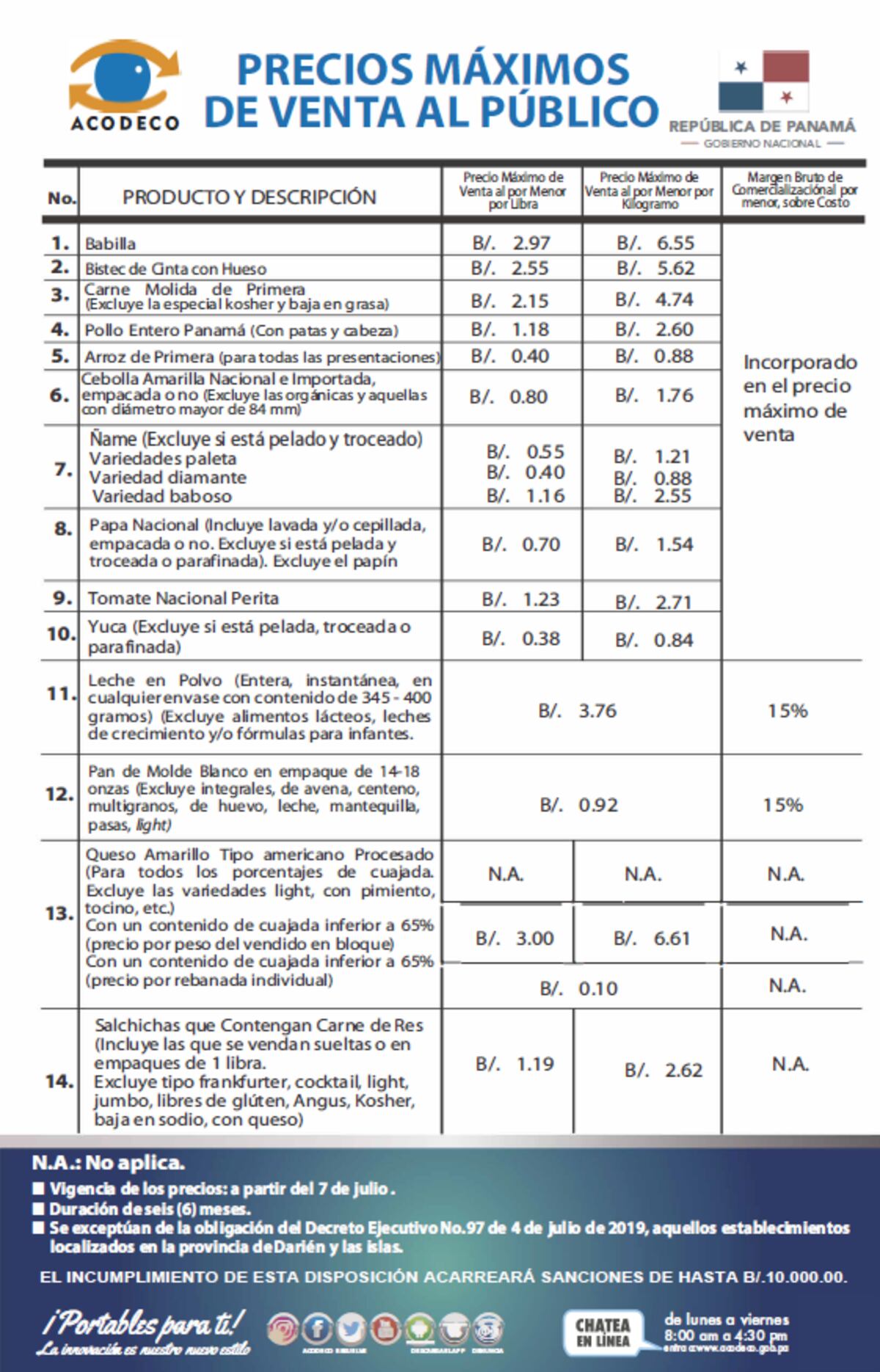 A través del Decreto Ejecutivo No 31 de 7 de enero de 2020 el presidente de la República Laurentino Cortizo prorrogo por seis meses la vigencia del Decreto Ejecutivo No 165 de 1 de julio de 2014, sobre el control de precios en 14 productos de la canasta básica familiar de alimentos.