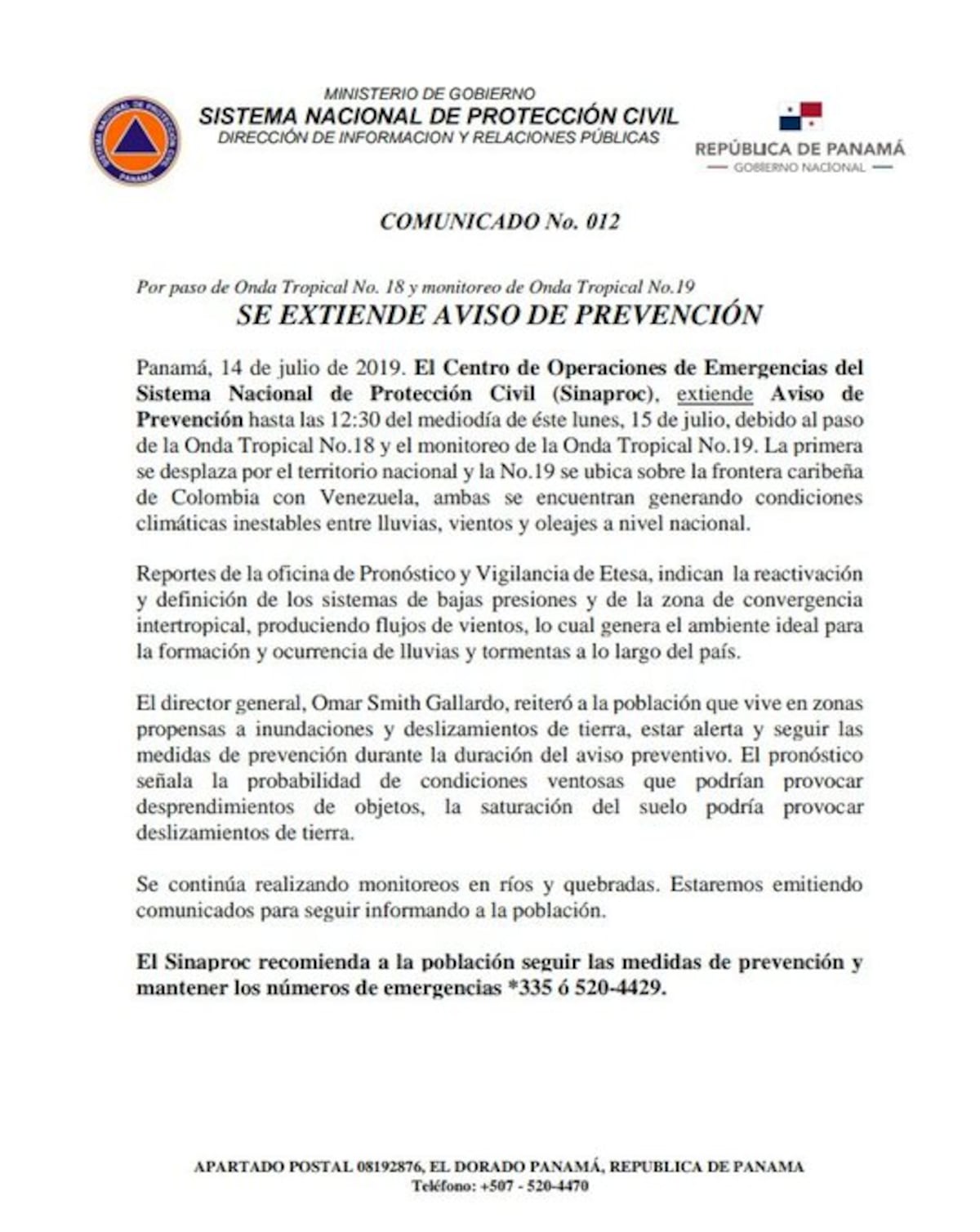 Omar Smith Gallardo, director del Sinaproc hizo un llamado a la población que residen en zonas propensas a inundaciones y deslizamientos de tierra, estar alerta y seguir las medidas de prevención mientras dure el aviso preventivo.