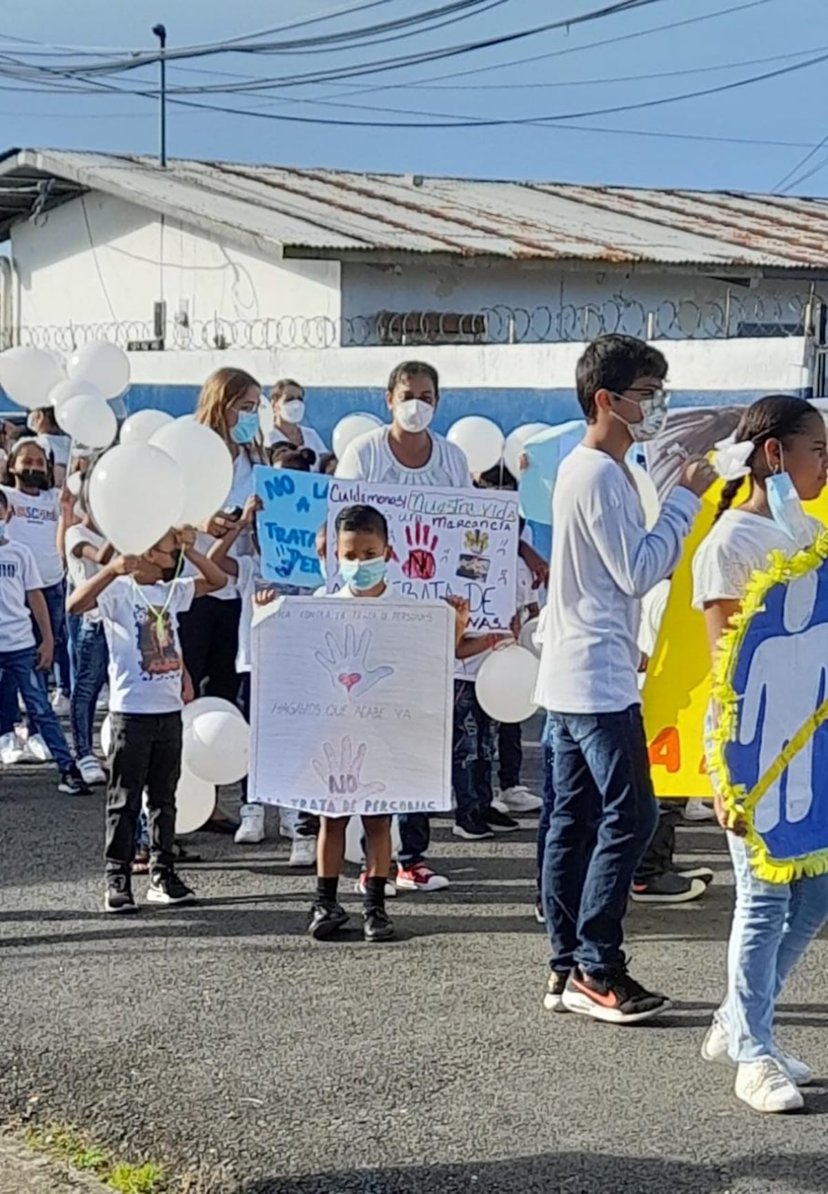 Alumnos y personal docente del Gaspar Octavio Hernández salieron todos de blanco la mañana de este viernes, 23 de septiembre, en el marco del Día Internacional contra la Explotación Sexual y la Trata de Personas, y realizaron una marcha por toda su comunidad portando pancartas y globos blancos. Fotos: Vicenta M. Herrera. Cortesía para Mi Diario PanamaLa Comisión Nacional contra la Trata de Personas que preside el ministro de Seguridad Pública, Juan Manuel Pino F., ha indicado que en 2021 hubo más casos de trata en modalidad laboral con un 55%, un 35% sexual, 5% de servidumbre sexual y servidumbre doméstica 5%, mientras que en lo que va de 2022, nuevamente la explotación sexual se eleva y con un porcentaje mayor en atención a las niñas y adolescentes de la “Operación Luz de Esperanza”.