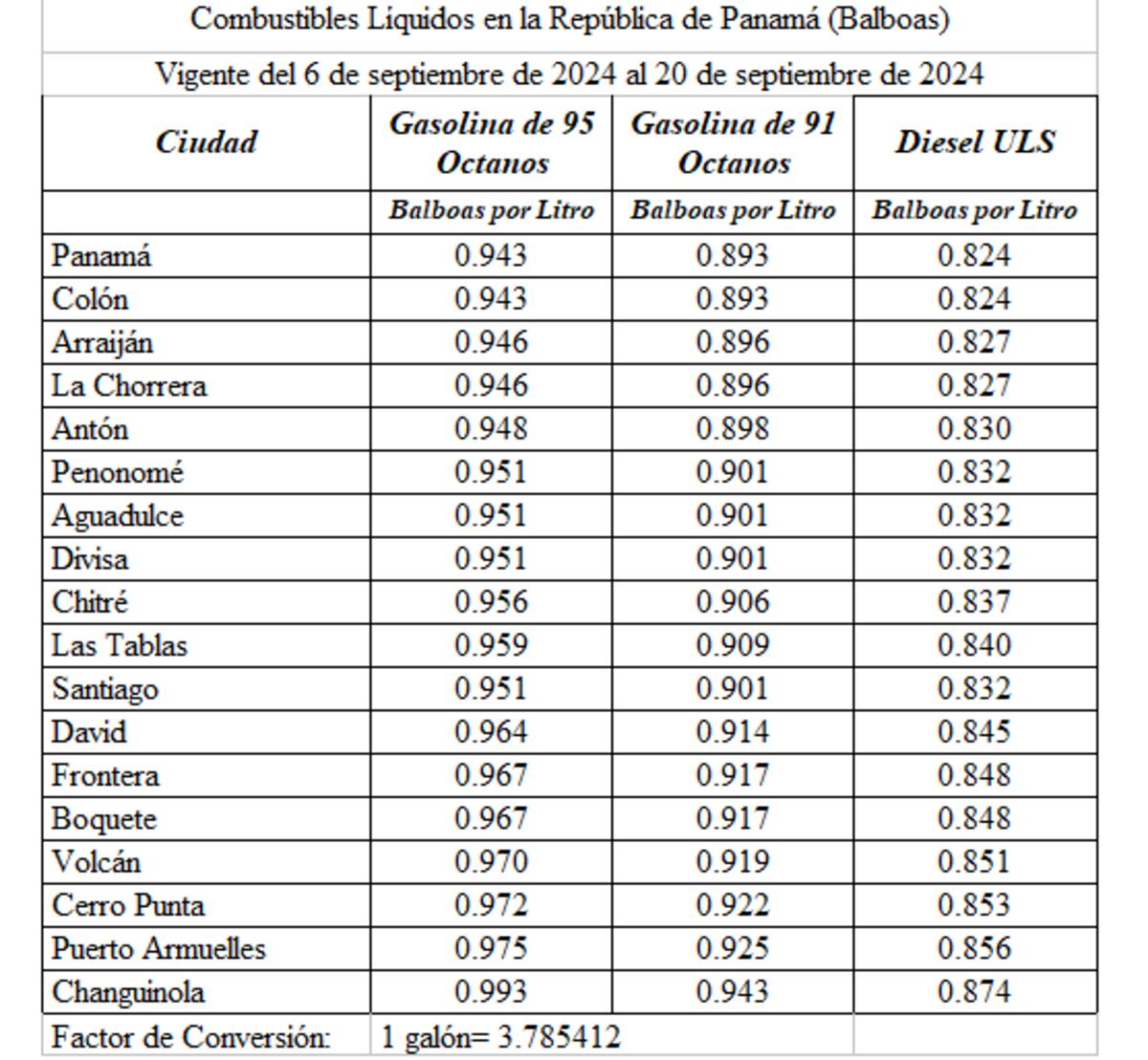 Cuadro de precios a nivel nacional.Los panameños podrán notar una baja significativa en los precios de la gasolina y el diésel. La gasolina de 95 octanos tendrá una reducción de 0.22 centésimos por galón, mientras que la gasolina de 91 octanos disminuirá en 0.17 centésimos. Por su parte, el diésel también reducirá su precio, aunque de manera más moderada, en 0.04 centésimos por galón.