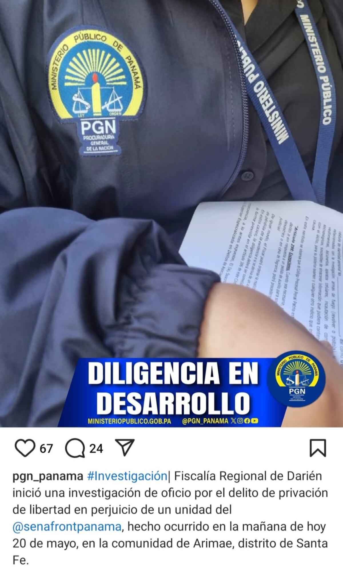 La Procuraduría General de la Nación (PGN) anunció que ha iniciado una investigación de oficio por el presunto delito de privación de libertad en perjuicio de una agente del Servicio Nacional de Fronteras (Senafront), en un hecho ocurrido este martes en la comunidad de Arimae, distrito de Santa Fe, provincia de Darién.