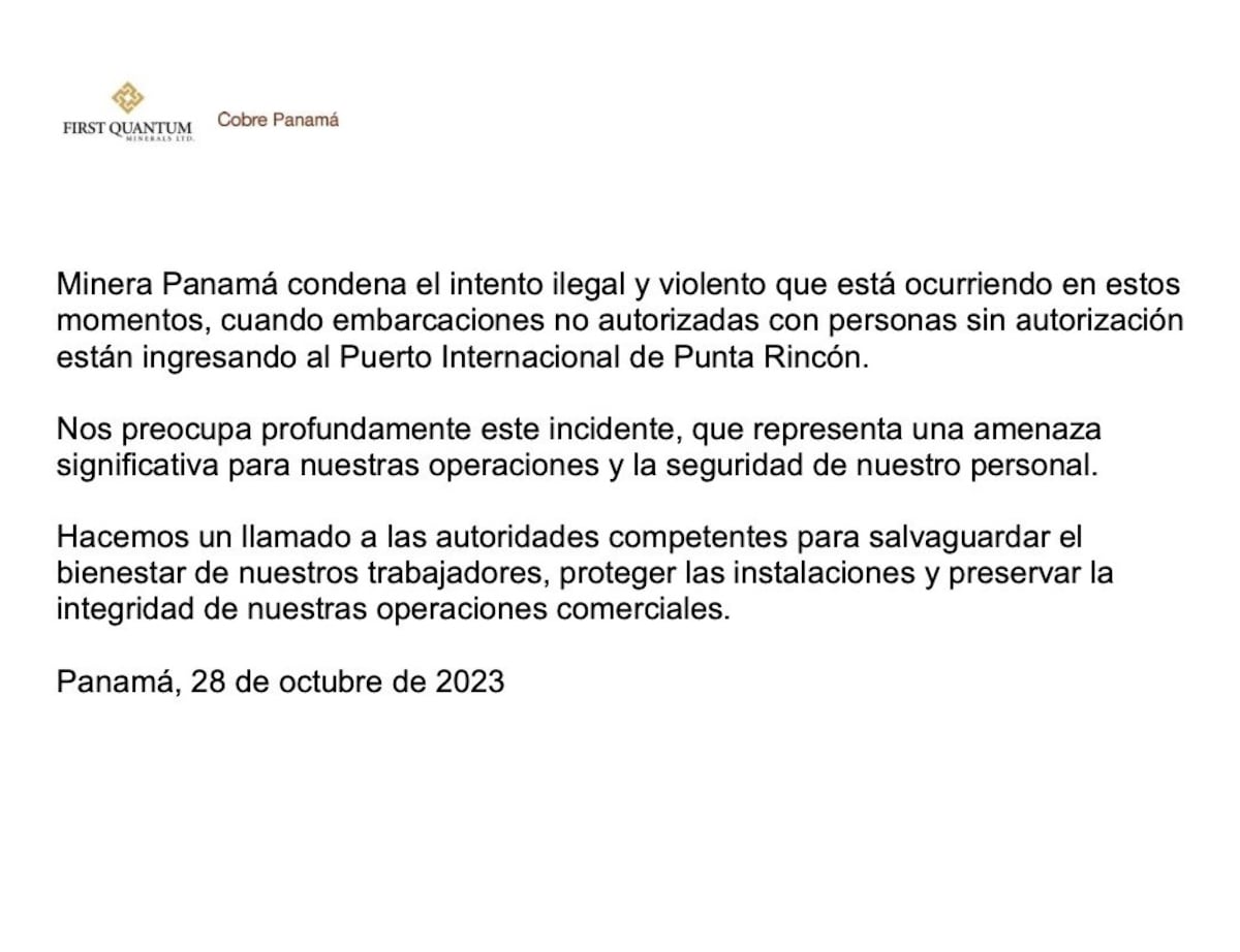 Minera Panamá emitió un comunicado. Indicó que “condena el intento ilegal y violento que está ocurriendo en estos momentos, cuando embarcaciones no autorizadas con personas sin autorización están ingresando al Puerto Internacional de Punta Rincón”.
