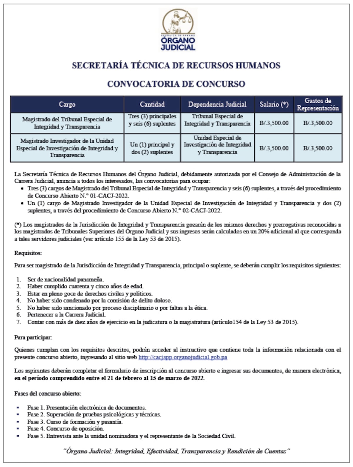 El Consejo de Administración de la Carrera Judicial instruyó a la Secretaría Técnica de Recursos Humanos del Órgano Judicial, para que a partir del 21 de febrero de 2022 realice una nueva convocatoria para ocupar tres cargos de Magistrados del Tribunal Especial de Integridad y Transparencia y seis suplentes y un cargo de Magistrado Investigador y dos suplentes.