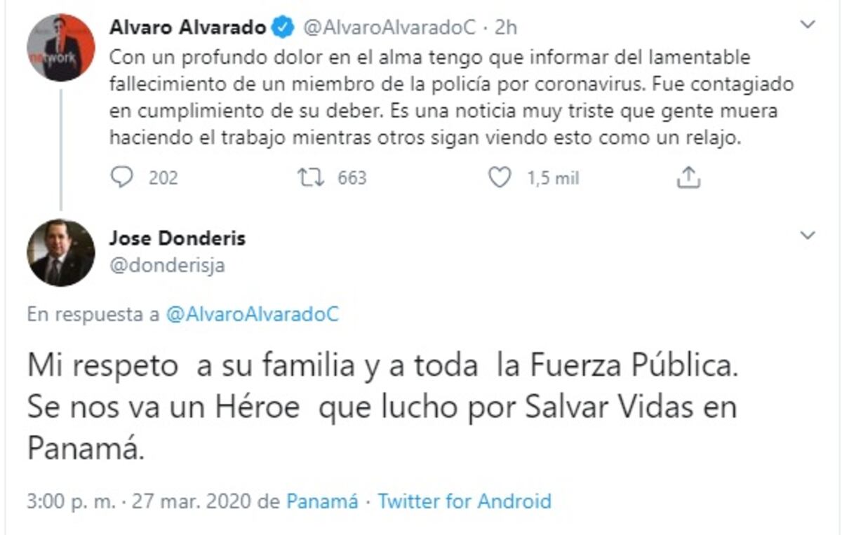 “Con un profundo dolor en el alma tengo que informar del lamentable fallecimiento de un miembro de la policía por coronavirus. Fue contagiado en cumplimiento de su deber. Es una noticia muy triste que gente muera haciendo el trabajo mientras otros sigan viendo esto como un relajo”, manifestó el comunicador Álvaro Alvarado.