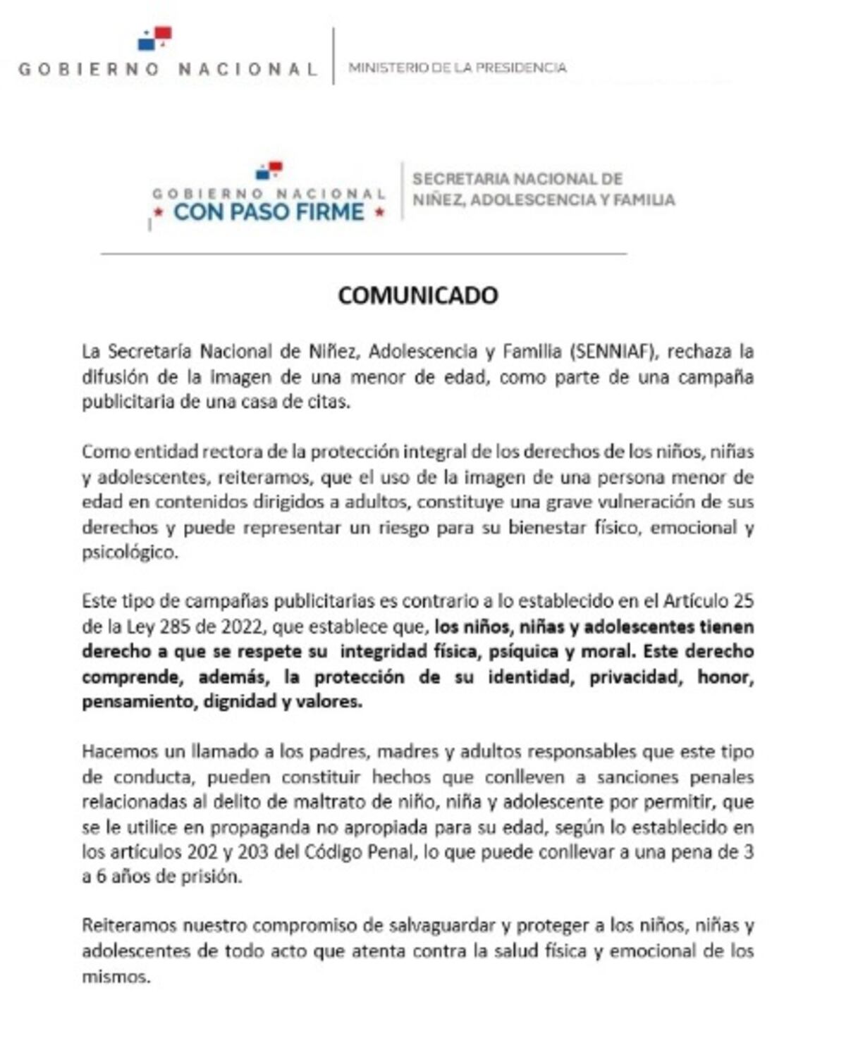El mensaje de la entidad fue directo: “la difusión de la imagen de una menor de edad como parte de una campaña publicitaria de una casa de citas es inaceptable y vulnera los derechos de la niña”.