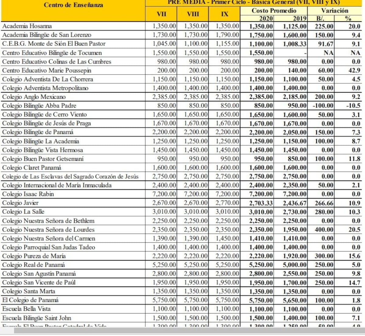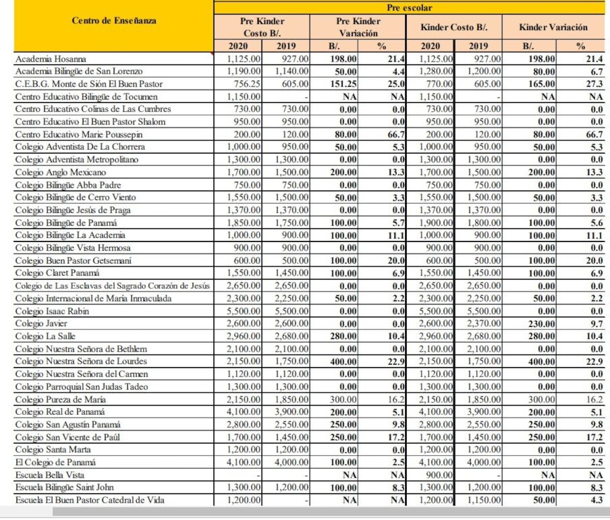 Este es el resumen ejecutivo de las variaciones de precios en torno al próximo periodo lectivo, informó el administrador general, Jorge Quintero Quirós.