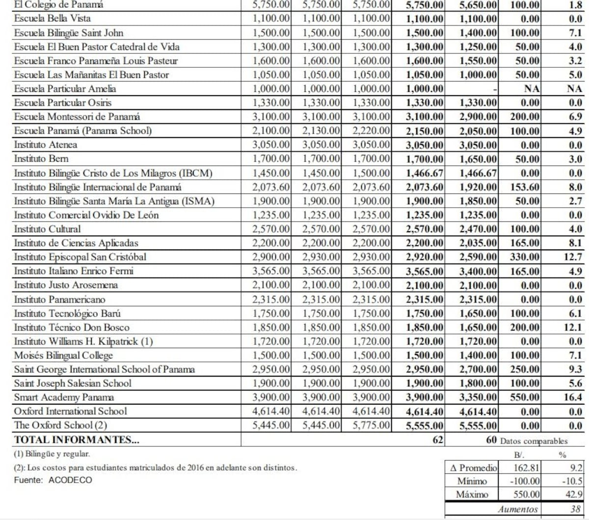 Cabe destacar que para decidir estos aumentos de costos, se debe cumplir con el Decreto Ejecutivo 601 de 2015, referente a las coordinaciones entre colegios, padres de familia y el MEDUCA. De incumplir con este requisito, la Acodeco podrá intervenir e iniciar procesos, que pueden finalizar en sanciones.