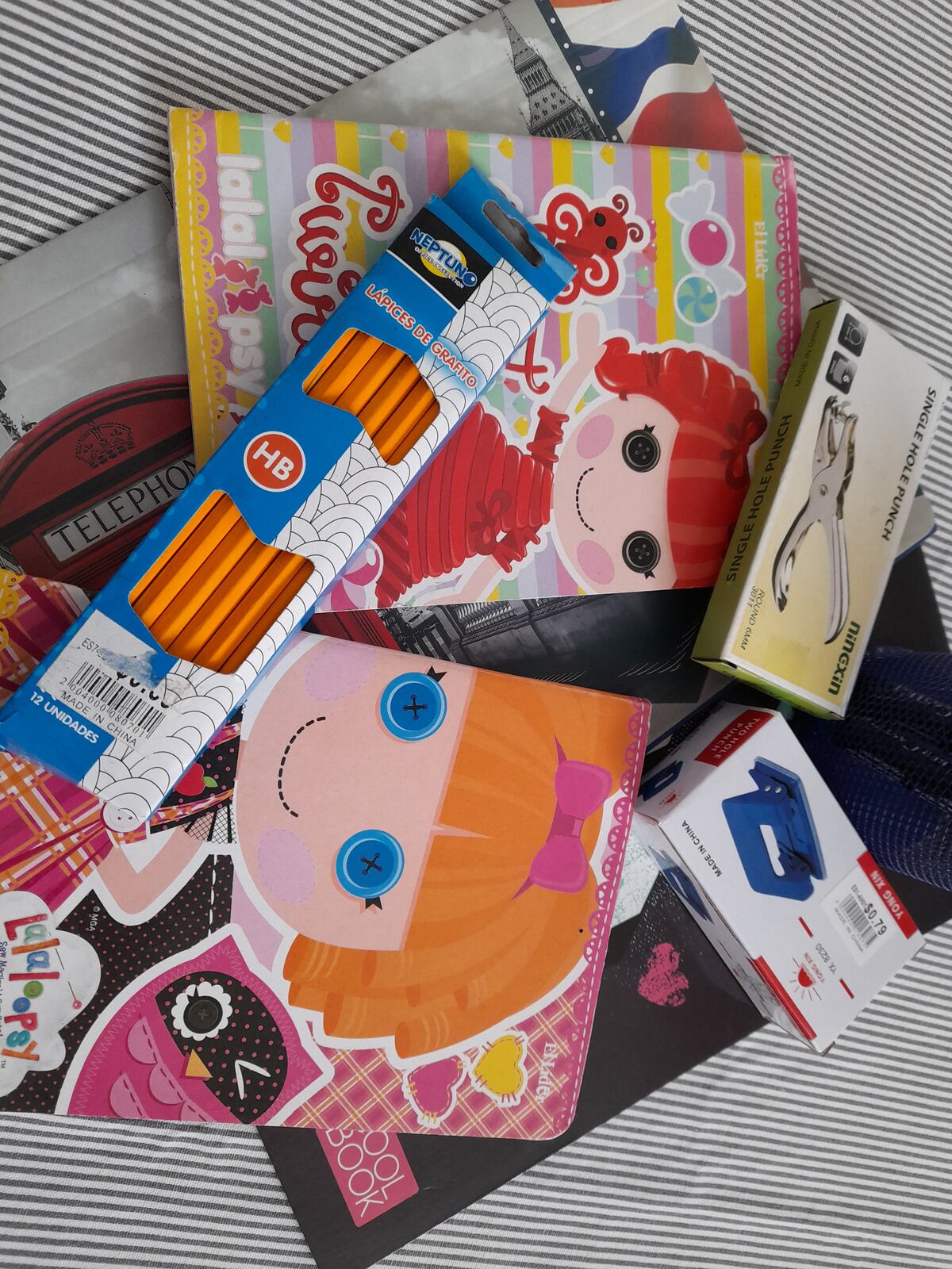 Cuadernos, lápices, etiquetas de cuaderno, masilla, juego de geometría, libros de colorear, libros de cuentos.