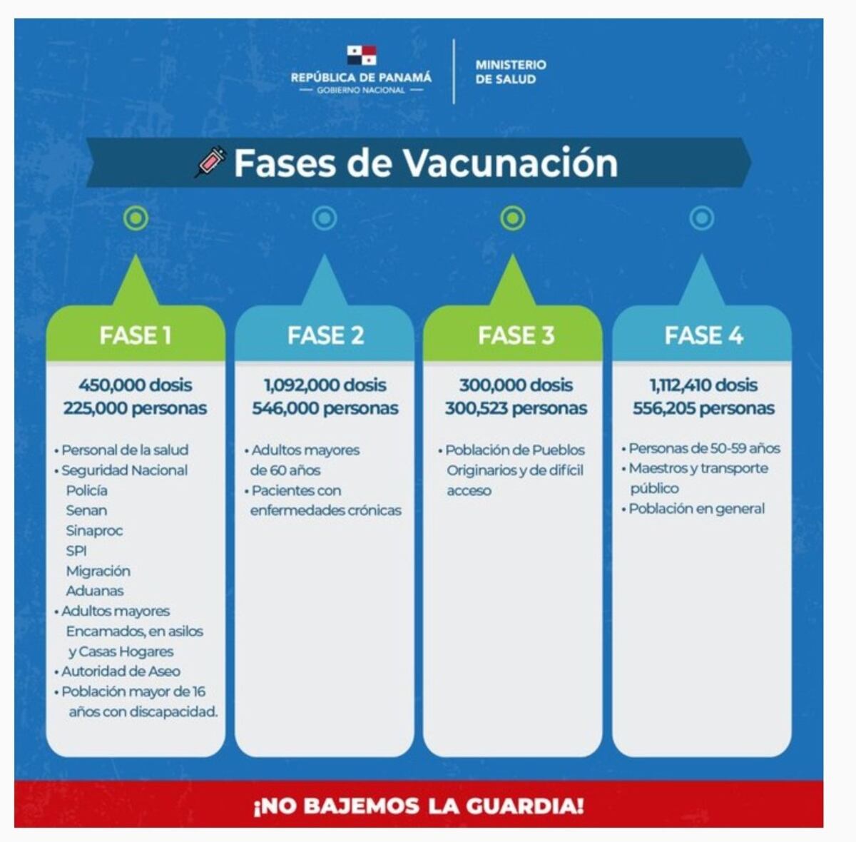 Este martes, 5 de enero, el Ministerio de Salud reiteró que la población prioritaria para las vacunas, en su primera fase, es el personal de salud, seguridad Nacional y los adultos mayores encamados, en asilos y casas hogares, así como personal de Autoridad de Aseo y población de más de 16 años con discapacidad.