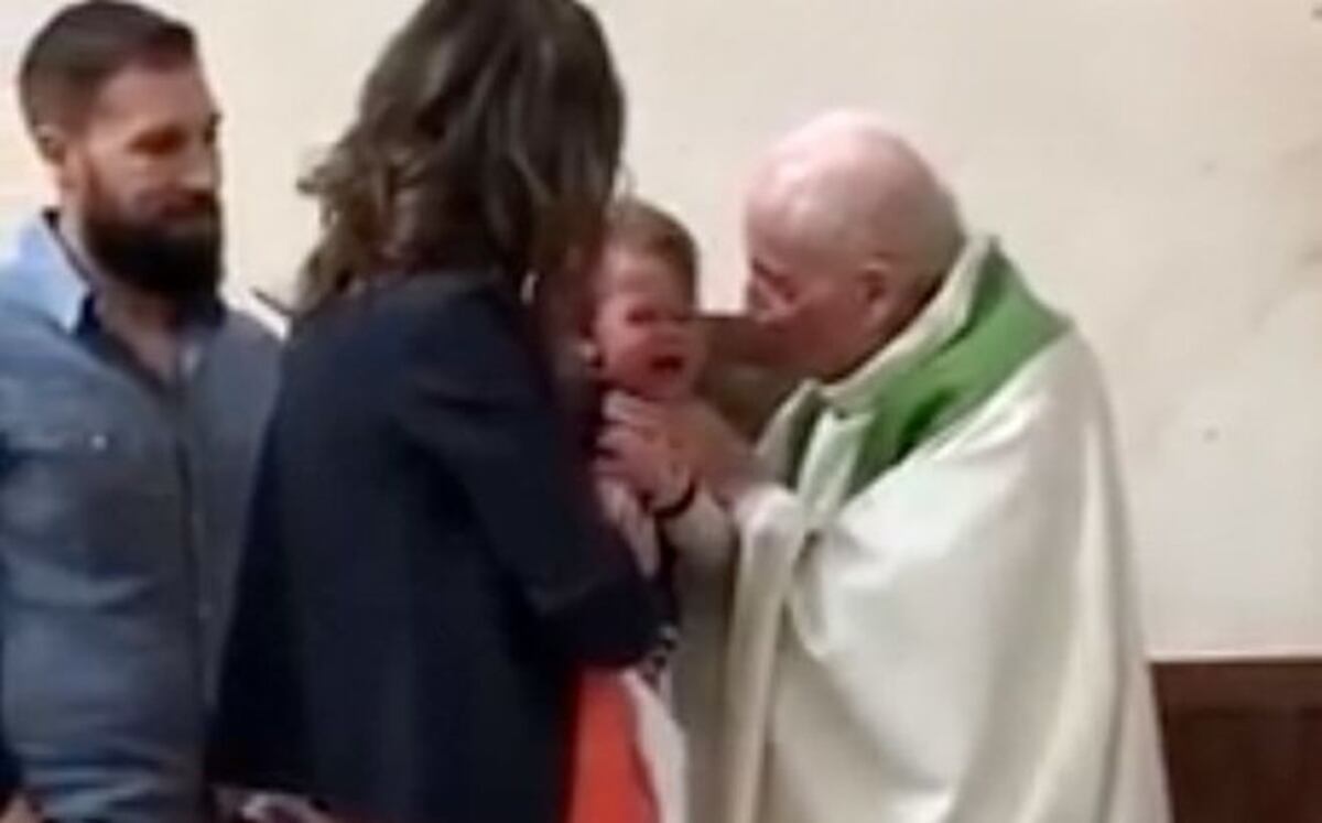 Sin embargo, esa actitud solo asusta aún más al menor y, en lugar de tratar de tranquilizarlo, el cura decide darle una bofetada para que se calle. Tras esto, el hombre que está detrás, presumiblemente el padre del bebé, arrebata no sin esfuerzo al pequeño de las manos del clérigo, que se rehusaba a entregarlo.